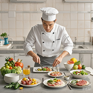 根据计算得出的各类营养素需求量,结合所选食材的营养成分含量,确定每餐每种食材的大致分量。 可以参考食物交换份法,将食物按照其营养成分特点分为不同的类别,每个交换份的食物含有大致相同的能量和营养素。例如,一个食物交换份的谷类(大米、面粉等)约为 25g(半两),一个交换份的蔬菜约为 500g(1 斤),一个交换份的水果约为 200g(4 两)等。通过食物交换份法,可以更加灵活地搭配食物,满足营养需求的同时,也便于控制食物的摄入量。 在确定食材分量时,还需要考虑食物的可食部分比例。例如,一个苹果的重量可能为 200g,但可食部分约为 150g;一块排骨的重量可能为 100g,但去除骨头后可食部分约为 50g 等。要根据实际可食部分的重量来计算营养素的摄入量和食物的搭配比例。