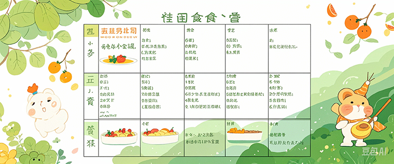 一般包括早餐、午餐、晚餐和加餐(如有需要)。 每餐应明确主食、菜品、汤品等的种类和大致分量。例如,早餐可以包括面包、牛奶、鸡蛋、水果;午餐可以有米饭、红烧肉、炒青菜、豆腐汤等。
